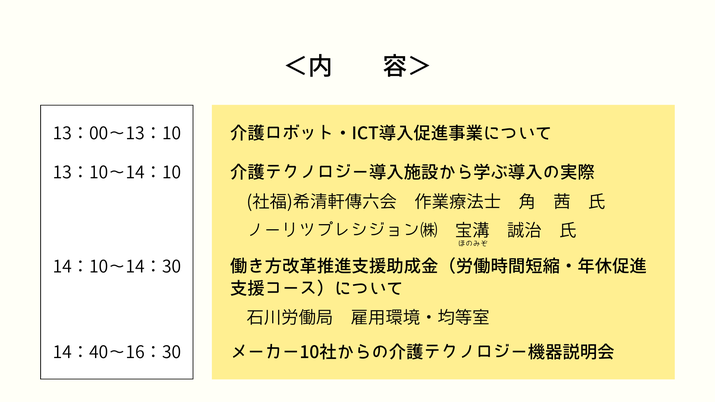 介護テクノロジー導入施設から学ぶ導入の実際や、補助金制度の説明、展示機器メーカーからの機器説明会を実施します。